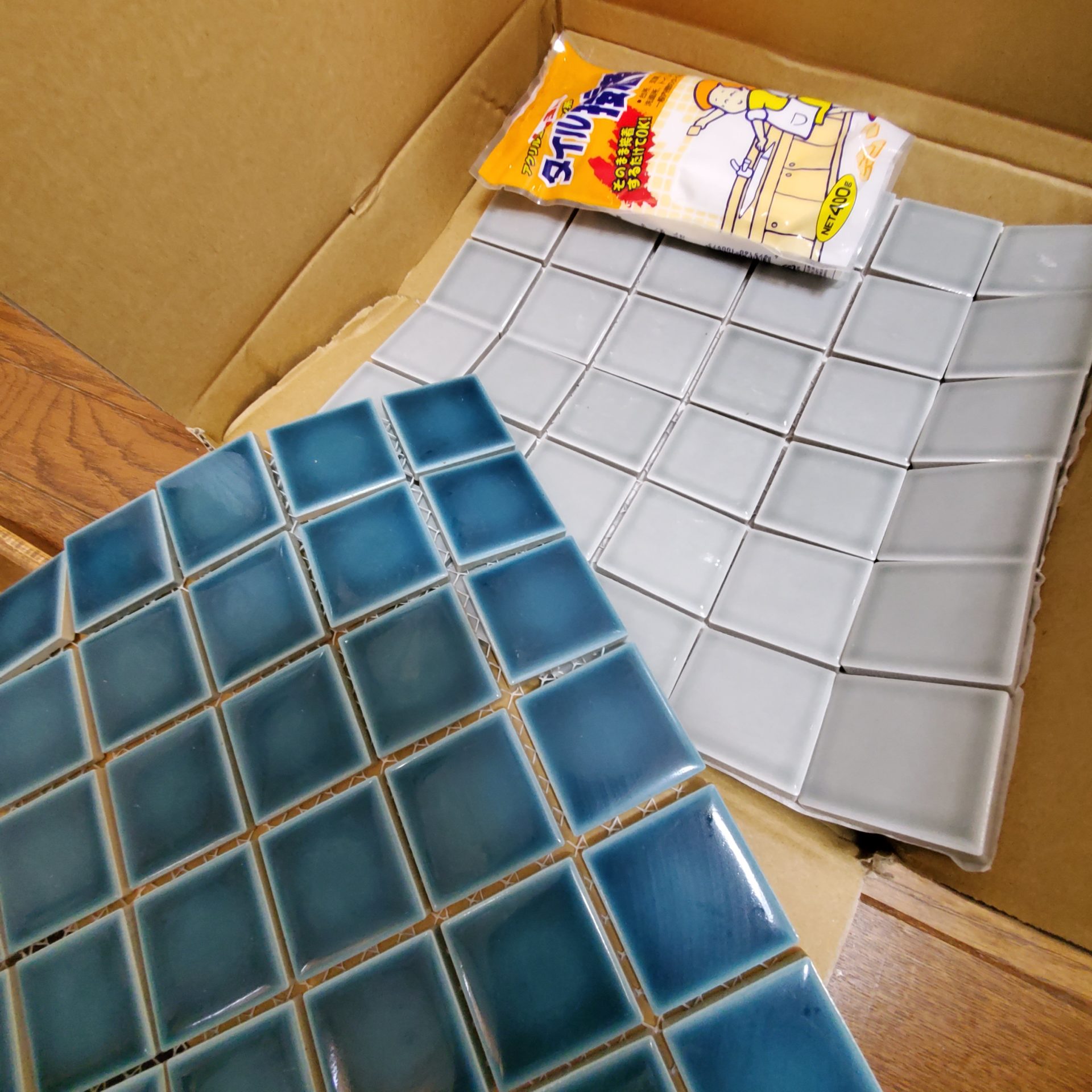 ↑使用したのは楽天の「タイルオンライン」さんで購入した45角タイルです。グラデーションのような深みのある色がとても素敵でずっと眺めていられる。こんなタイルの洗面台だったら最高だな~。スカイグレーとティールブルーの2色を購入しました。接着剤、目地も一緒に購入。