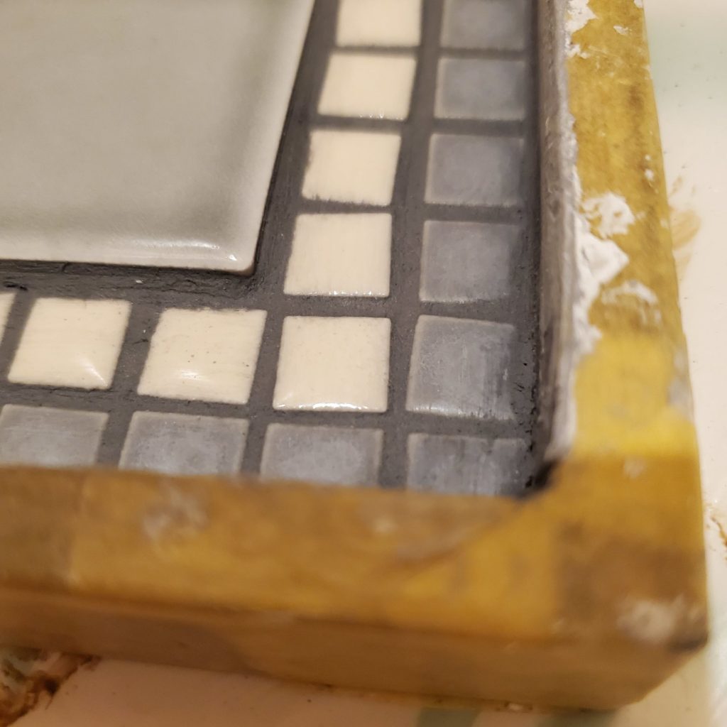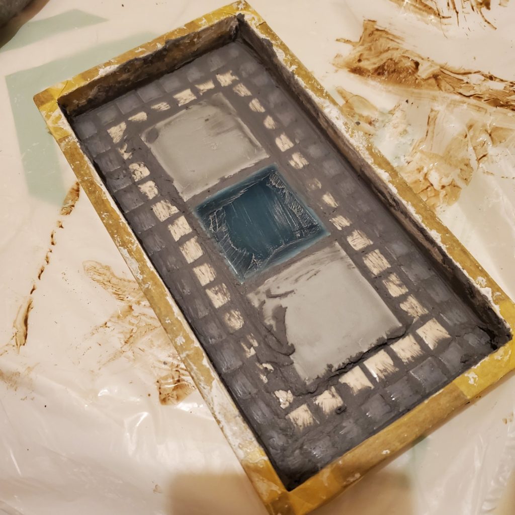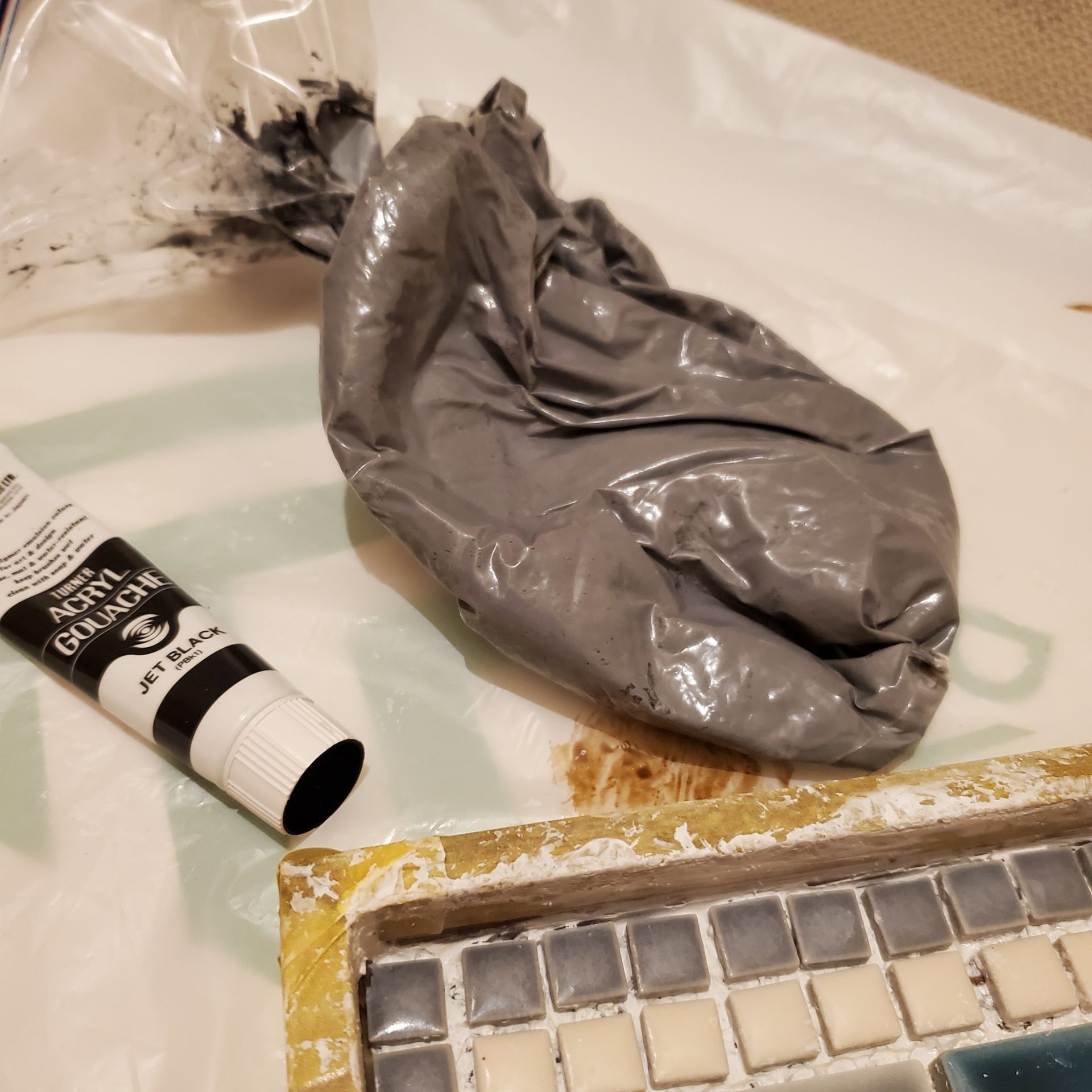目地材に黒のアクリル絵の具を混ぜ、グレーに。この目地材の着色は他にも応用できそうな予感。思った以上に綺麗に染まりました。
